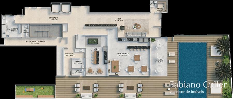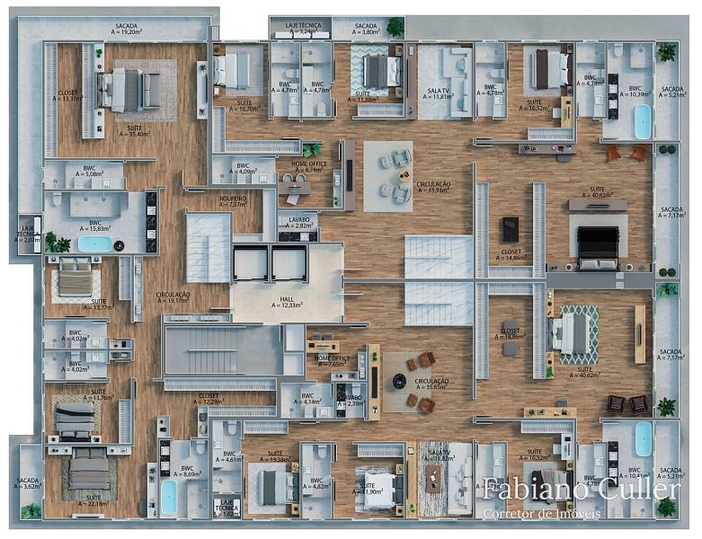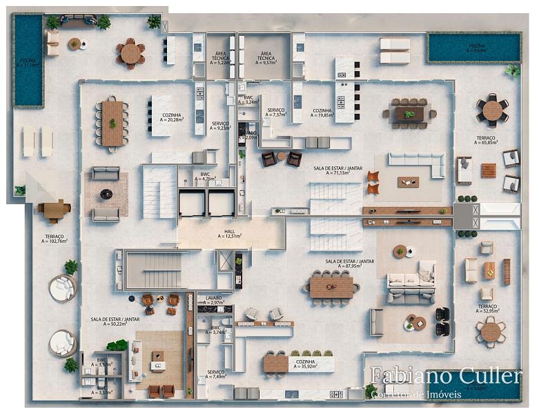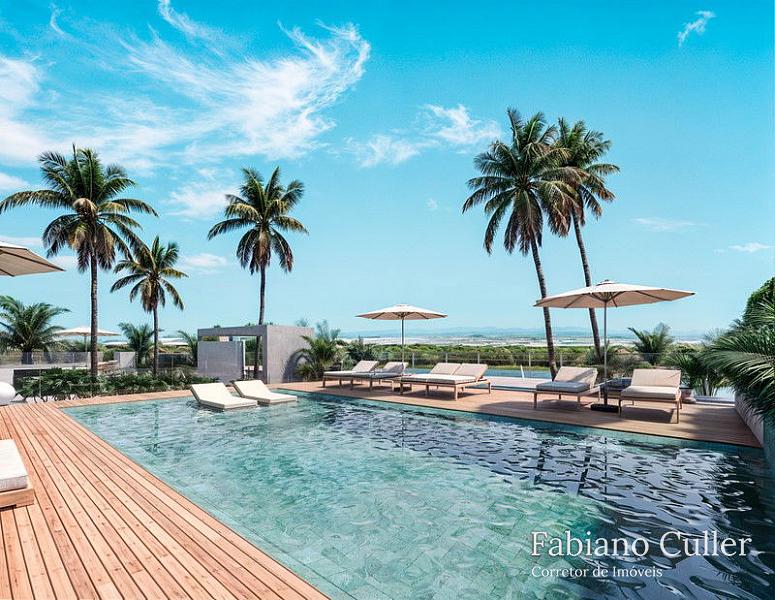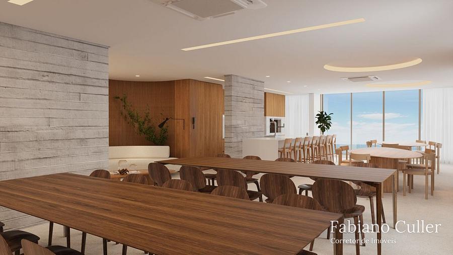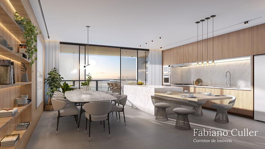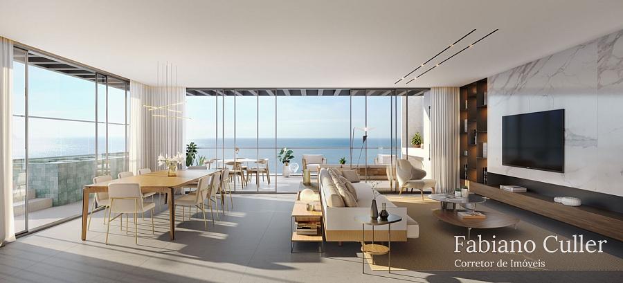 Cobertura duplex no Edifício Tirreno Residenziale de frente para o mar na Praia Brava, com 450m², ampla varanda com piscina privativa e churrasqueira à carvão, 4 suítes sendo 1 master de frente para o mar, , cozinha, sala para 2 ambientes, área de serviço, 4 vagas.